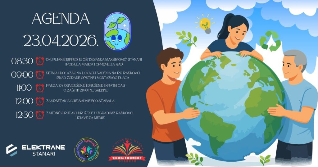 Поводом Међународног дана планете Земље, који се широм свијета обиљежава 22. априла, Омладински центар Станари, у сарадњи са ЈУ ОШ „Десанка Максимовић“ Станари, уз подршку “Електрана” Станари организује велику акцију пошумљавања и уређења животне средине.