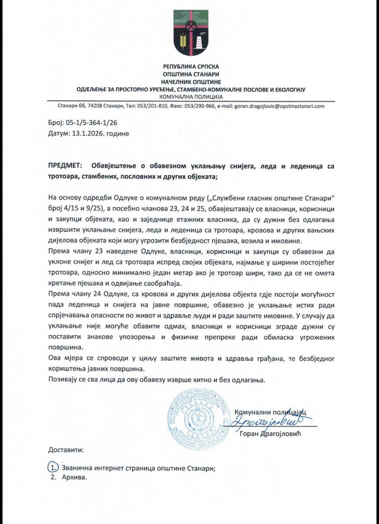 Обавјештавају се власници, корисници и закупци објеката на подручју општине Станари да су дужни, без одлагања, уклонити снијег, лед и леденице са тротоара, кровова и других дијелова објеката који могу угрозити безбједност грађана.