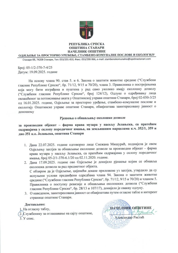 РЈЕШЕЊЕ О ОБНАВЉАЊУ ЕКОЛОШКЕ ДОВОЛЕ 23. September 2025. Објави на мрежи Twitter Facebook Pinterest LinkedIn