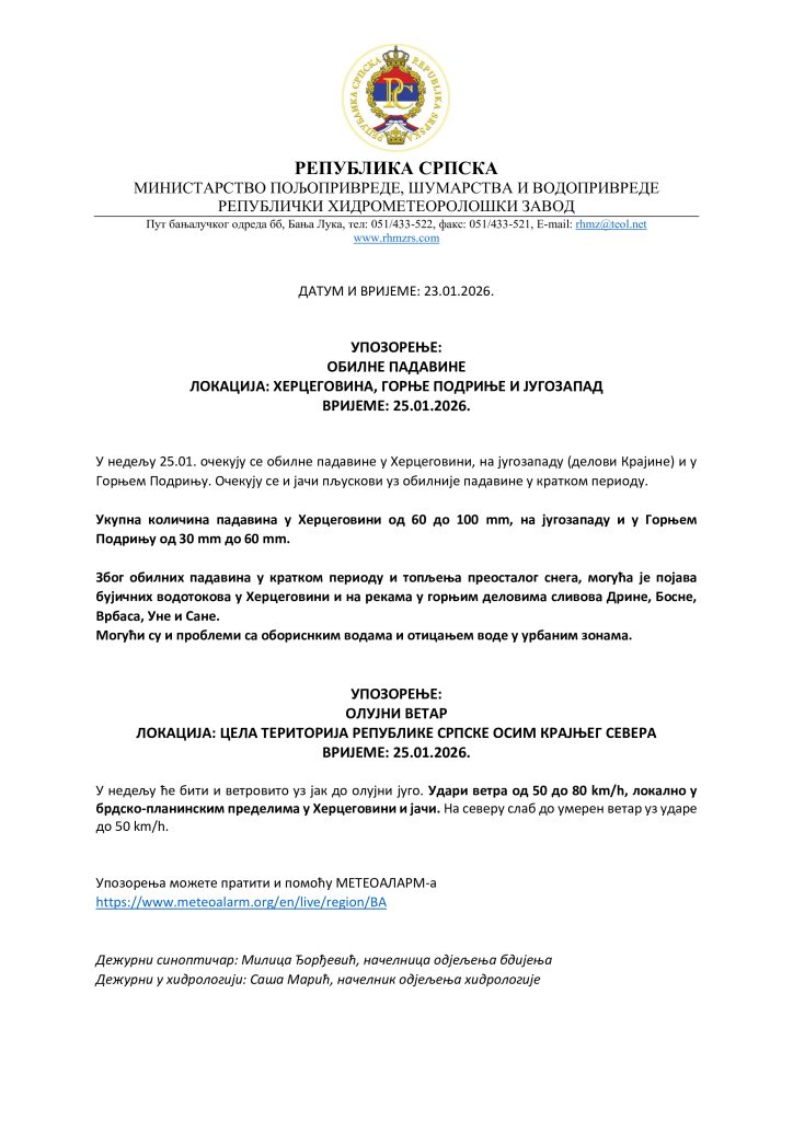 УПОЗОРЕЊЕ НА ОБИЛНЕ ПАДАВИНЕ