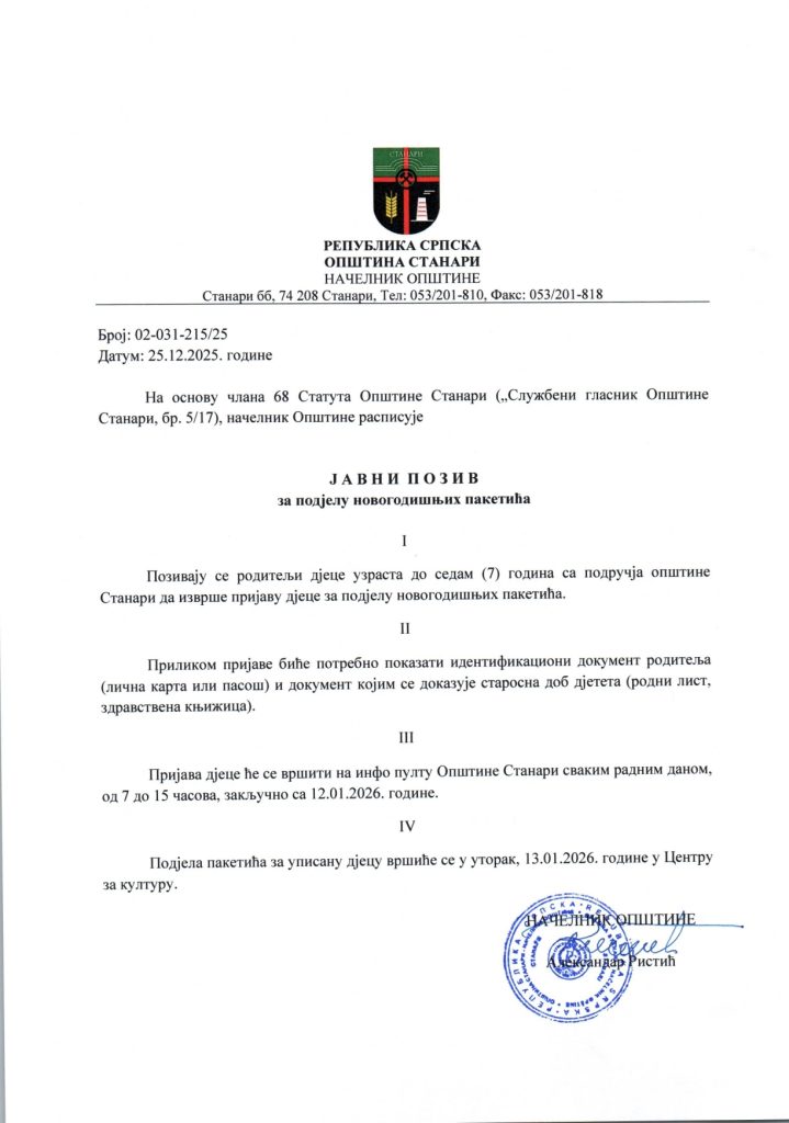 Начелник Општине Станари расписује Јавни позив за подјелу новогодишњих пакетића за дјецу узраста до 7 година са подручја општине Станари.