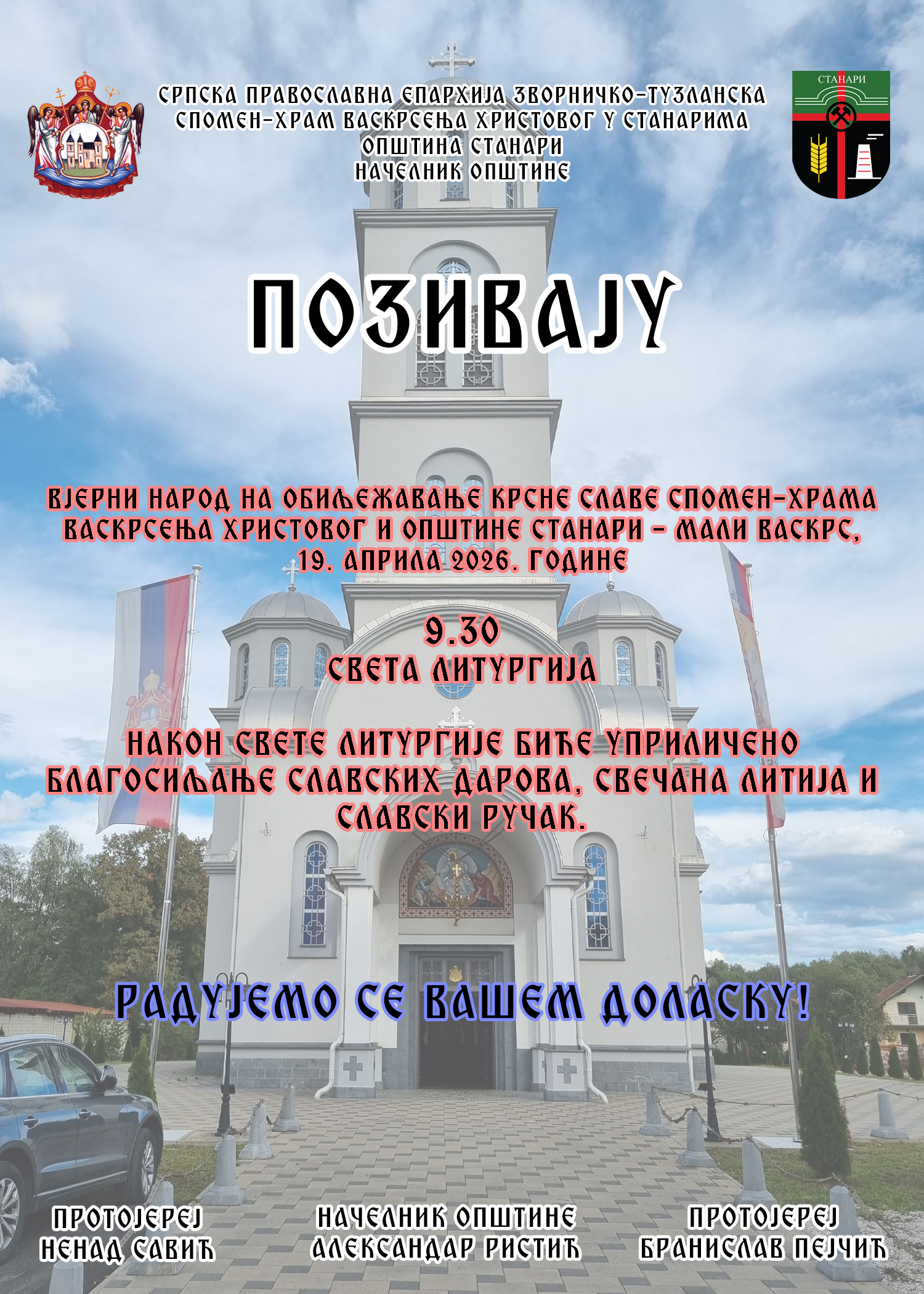 Позива се вјерни народ Општине Станари да присуствује свечаном обиљежавању Малог Васкрса – крсне славе Спомен-храма Васкрсења Христовог, као и крсне славе Општине Станари. Свечаност ће се одржати у недјељу, 19. априла 2026. године. Програм обиљежавања:– 09.30 часова: Света литургија–…